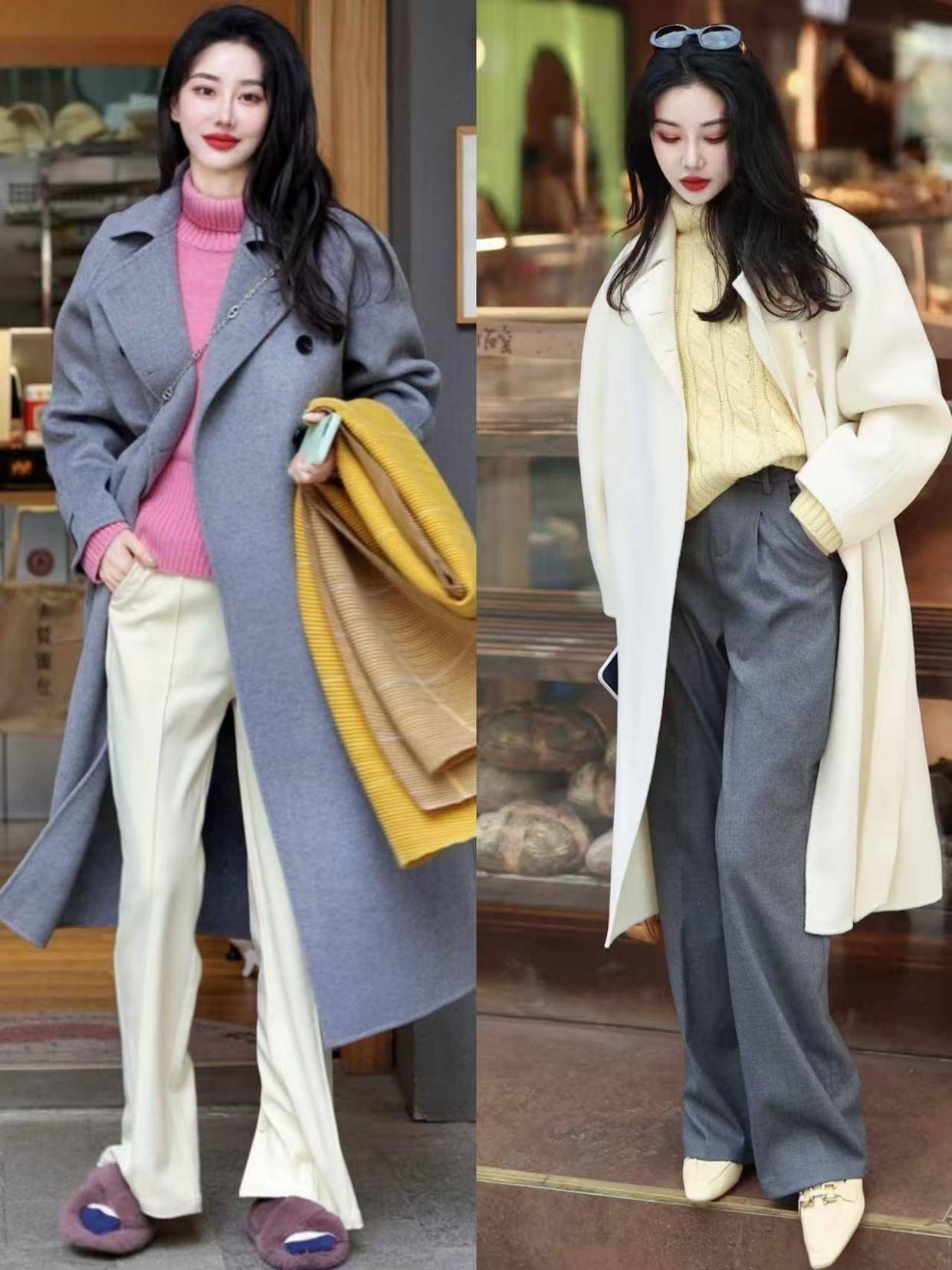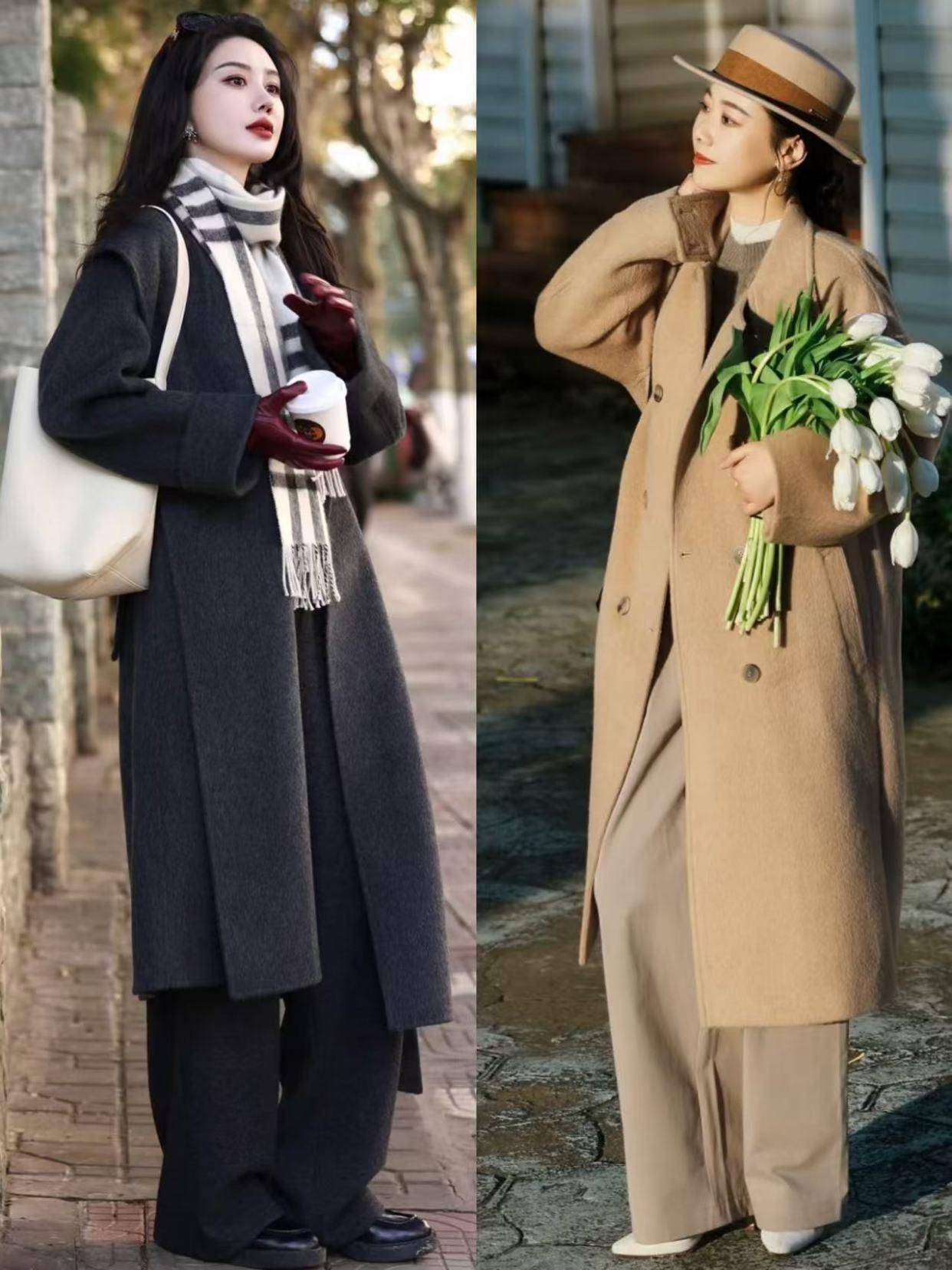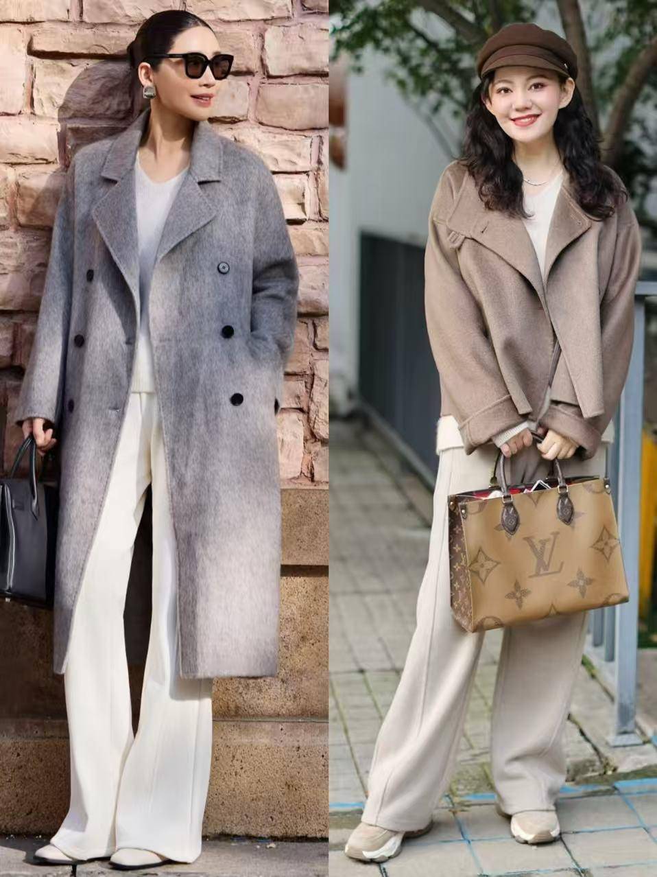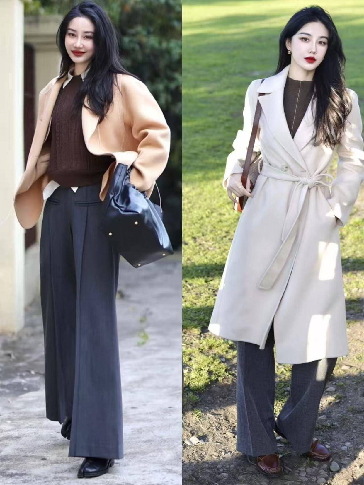 例如上面这2套穿搭,分别是灰色大衣和驼色大衣,下半身直接选择同色系的阔腿长裤来组合,就能让你的身材线条变得非常流畅,同时潇洒风姿尽显。
