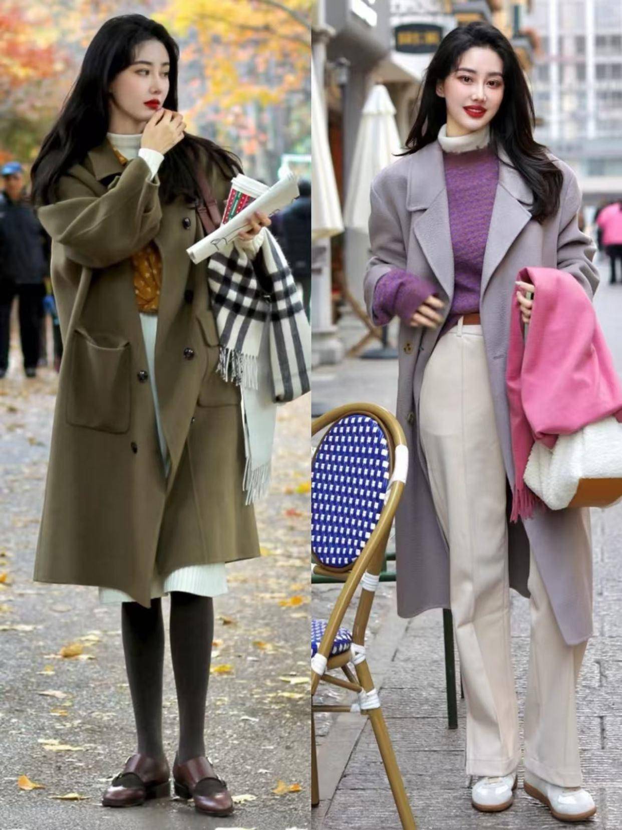 正常情况下,更推荐大家选择一条直筒阔腿裤,例如右边的这套穿搭,用浅紫灰的翻领大衣内搭紫色毛衣,加一件白色的高领针织衫,下装是一条白色西装直筒裤,这样的穿搭不光能让身材线条流畅,分分钟美到骨子里。