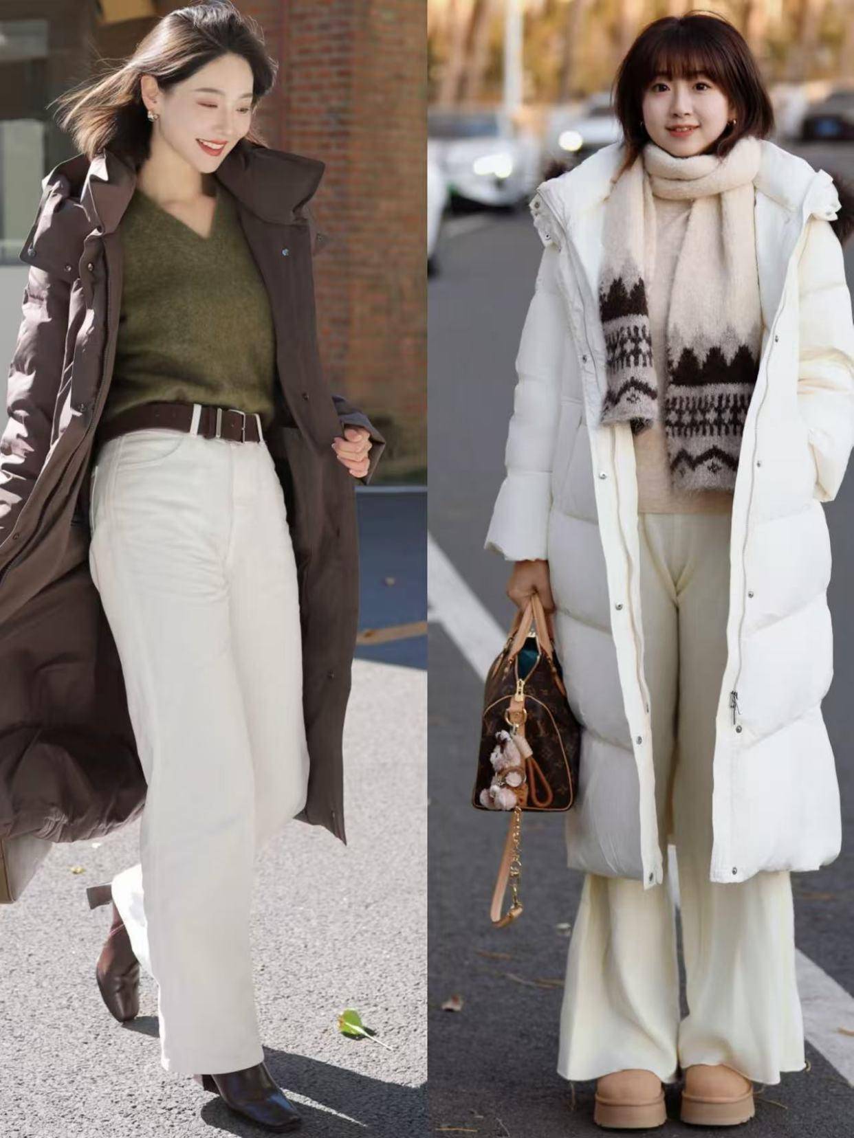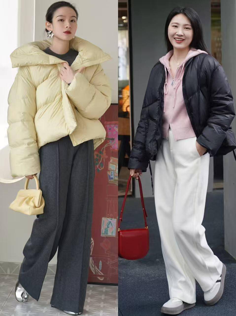 寒冷的冬天,我们首先肯定是要确保自己的穿搭比较保暖才敢出门,有的时候咱们肯定会选择带一点蓬松感的羽绒服外套来搭配上阔腿裤,如果你选择的裤子是紧身款,那整体就会形成头重脚轻,好像上面右边这一套穿搭用白色的阔腿裤搭配黑色羽绒服,经典耐看。