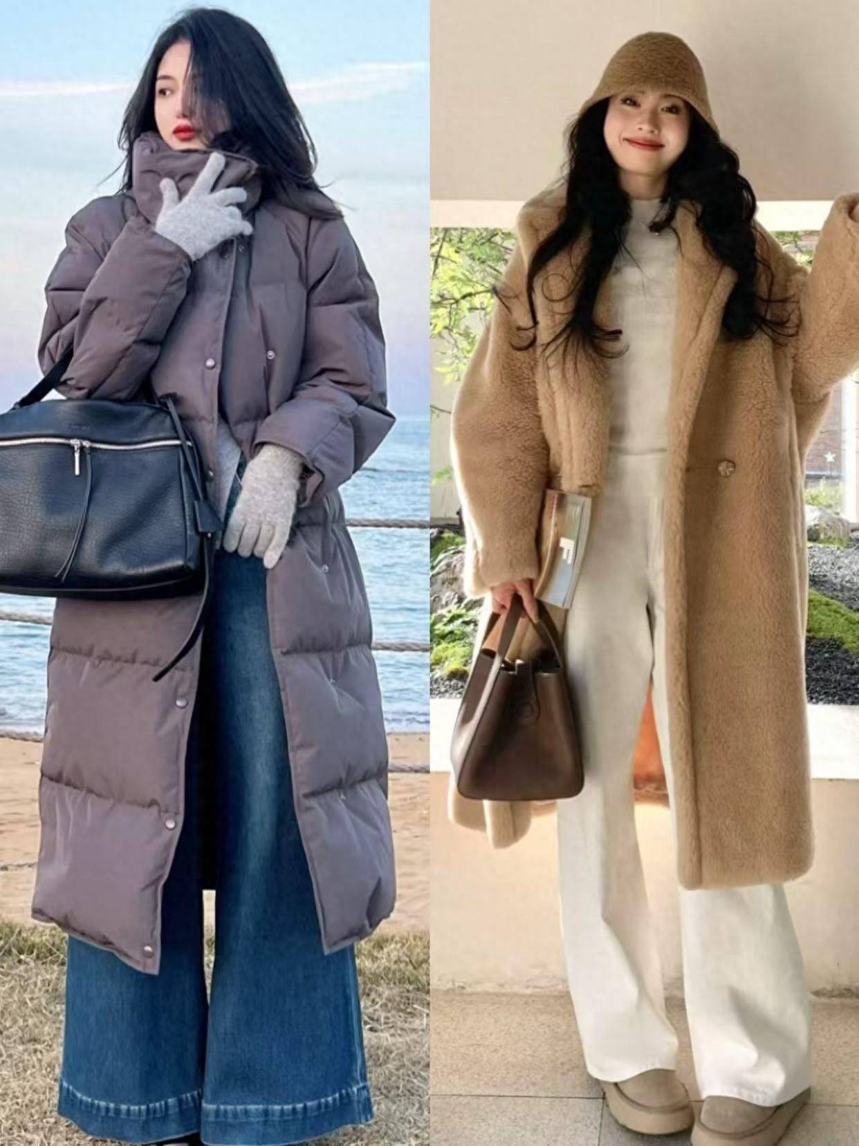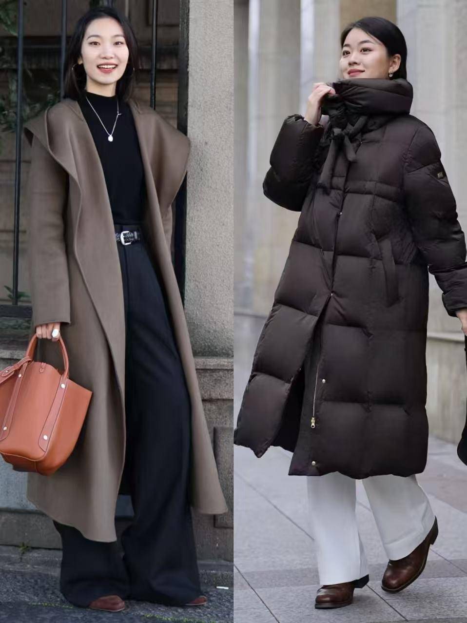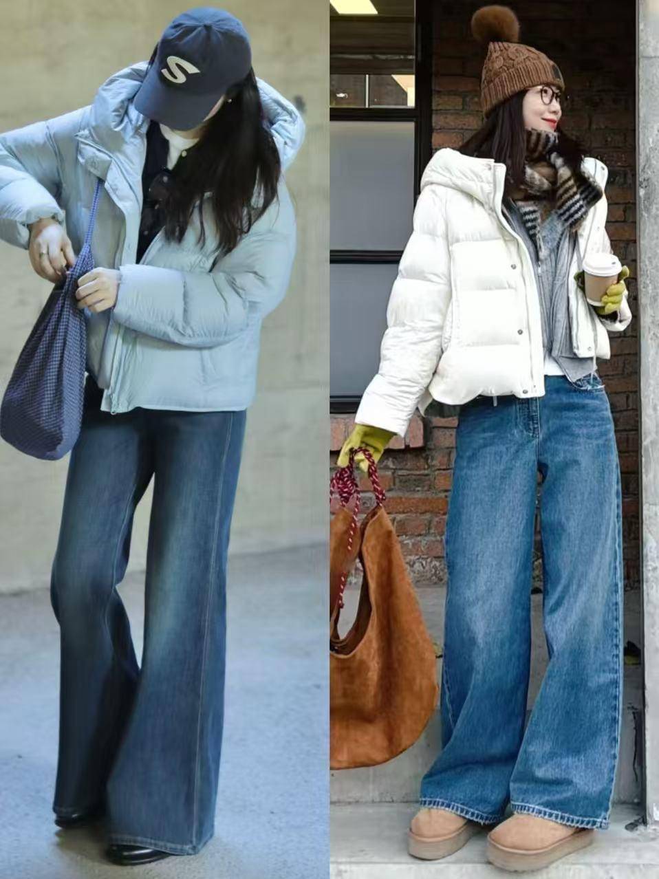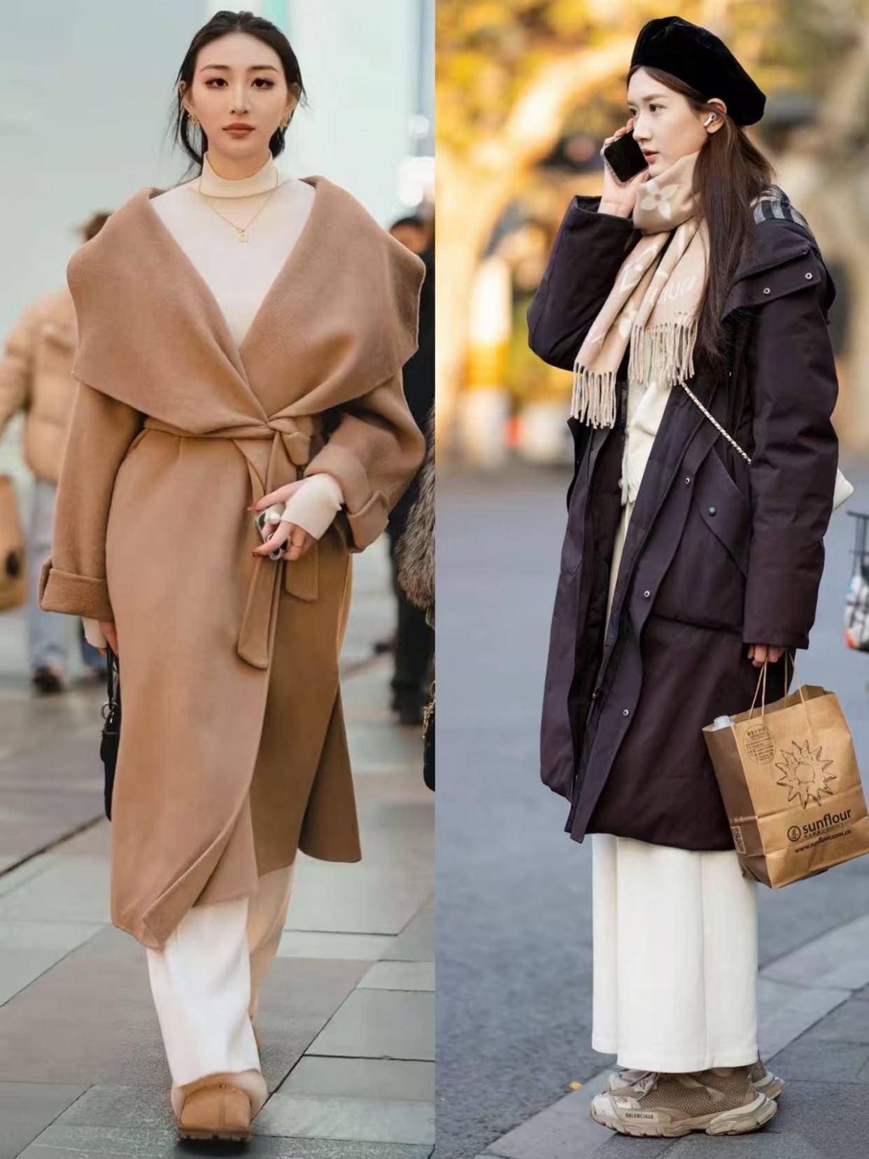 例如,上面成都女生的街拍穿搭,用一件长款的羽绒服外套搭配上牛仔阔腿裤,保暖时髦又遮肉。