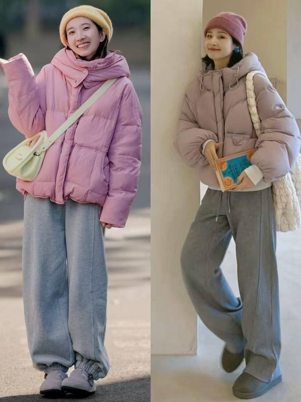 但千万不要用这种自带蓬松感的羽绒服搭配上紧身裤,要不然的话会显得头重脚轻。