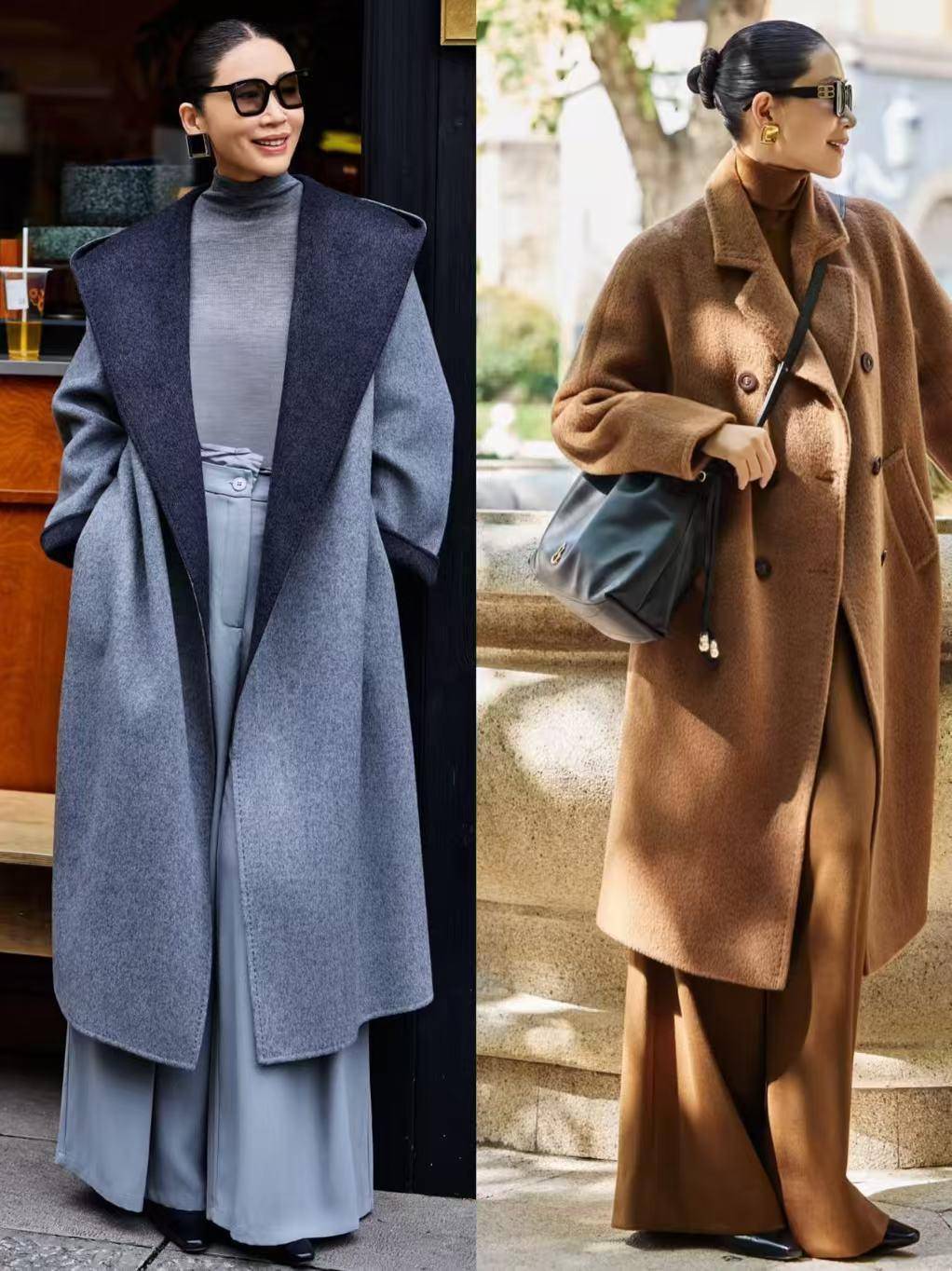 想让自己身材比较流畅的情况下,推荐大家选择h版型的大衣外套,而且面料一定要有垂坠感,不起毛不起球,有光泽感,上身效果自然会更高级。