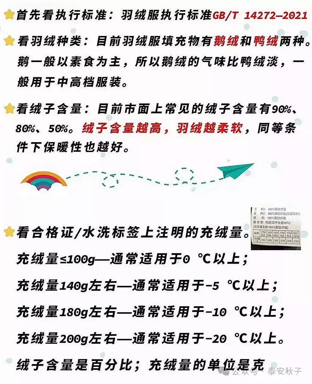 绒子含量指的是纯绒朵的占比,优先选 90% 及以上的,蓬松度好还不容易结块;执行标准得认准 GB/T 14272-2021,这是国内羽绒服的合格标准,买羽绒服的时候有它才靠谱。