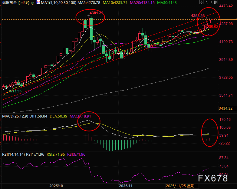 汇通财经APP讯——周一(12月15日)黄金(XAU/USD)正处于历史高位附近的强势震荡格局安徽股票配资,美联储货币政策的不确定性、地缘政治风险发酵、各国央行持续购金及黄金ETF资金净流入,共同构成金价的核心支撑。当前金价交投于4339美元附近,距离10月20日创下的4381美元历史峰值仅差42美元,虽然技术面依然面临MACD背离。对于交易员而言,本周美国经济数据密集窗口期的开启,将成为左右金价短期波动的关键催化剂。